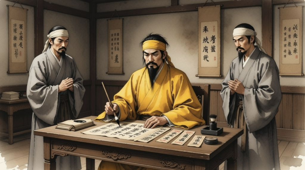 Zhang Jiao had been an unsuccessful candidate in keju (public examinations) for officialdom. While gathering herbal medicine in the mountainous wilderness, he allegedly met an old sage named South China Ancient Sage (Nanhua Laoxian) from whom he received the 3-volume Celestial Peace Methods (Taiping Yaoshe). A talented propagandist and messianic faith-healer, Zhang Jiao proclaimed himself pope of a new religion based on a synthesis of Huangdi (Yellow Emperor), primeval mythical sovereign, and a deified Laozi.